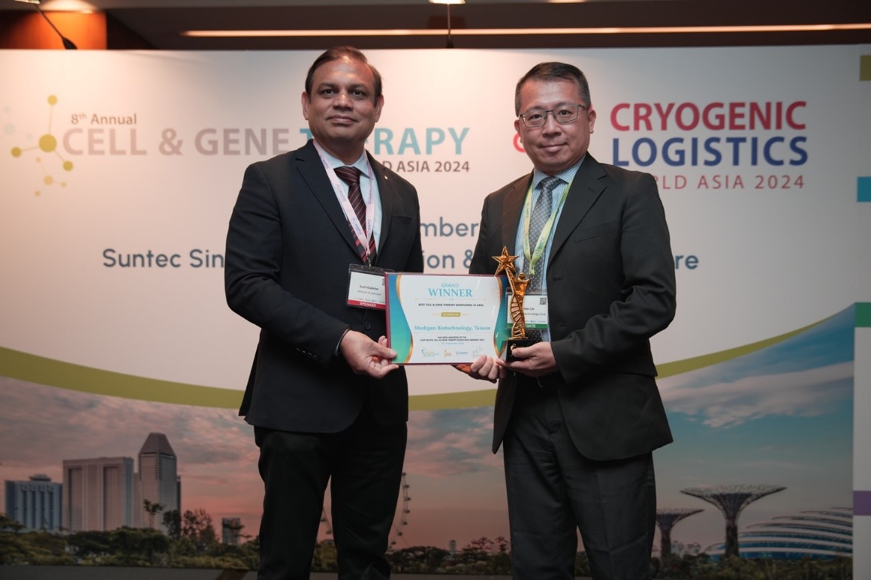基亞生技於新加坡Suntec會展中心獲頒Best Cell & Gene Therapy Biopharma in APAC,本公司由林杰良博士代表接受Mr. Sunil Gadekar頒發獎牌。