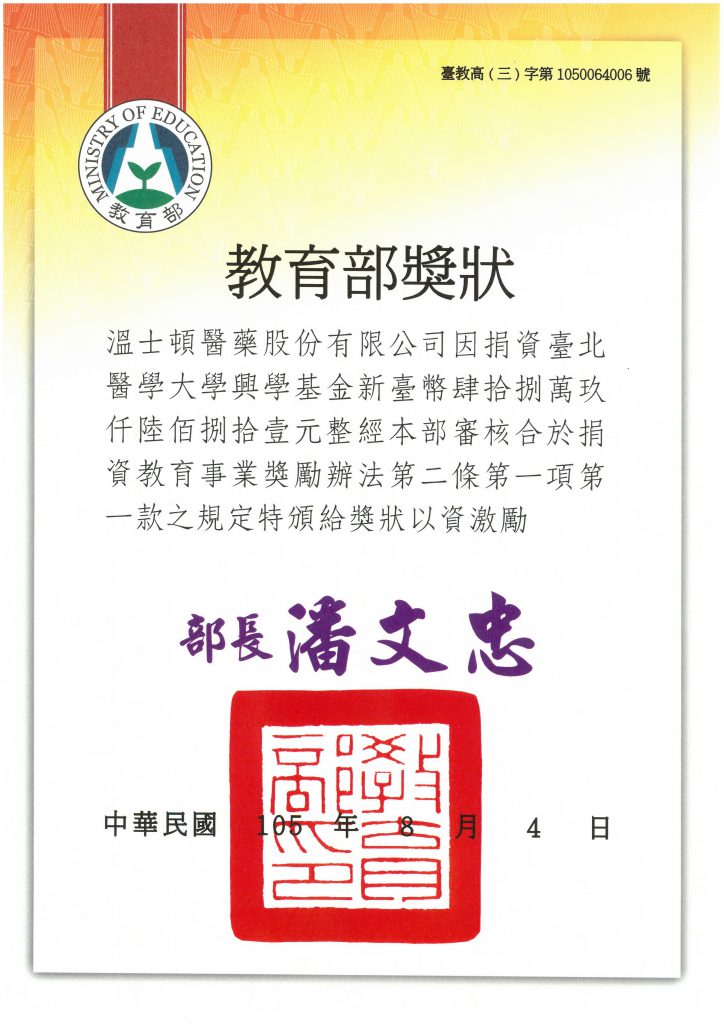 心懷對醫藥學界的感謝並期望能帶給民眾更優質的醫療服務,溫士頓醫藥捐資台北醫學大學肆拾捌萬餘元,熱心公益不落人後。
